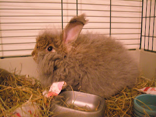 My vet's office called yesterday morning, asking if I could take in a homeless bun. He and some other boys were bought from a person raising them for meat and were used to practice new neutering and anesthesia techniques. I'm still trying to figure out his breed, and the best I can do is a Jersey Wooly cross - he's too big to be a full JW, and his coat is too wooly for him to be an angora. His color is hard, too, since his face is brown agouti (like a wild rabbit's), but his wool is gray. Opal, squirrel, or the British color brown-gray are my top guesses. His coat is all puffed out, so he looks like a big dust bunny. Photos soon - before I start brushing his coat and he likely lose it all like Squiggy did during his shed and end up looking nekkid!